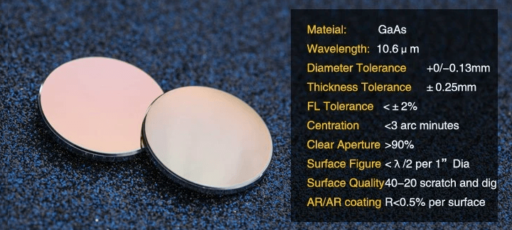 Lentes GaAs tem alta resistência ao choque térmico e estabilidade em praticamente todos os ambientes, Para obter transmitância superior, os cristais de GaAs são cultivados pelo processo de Deposição de Vapor Químico.